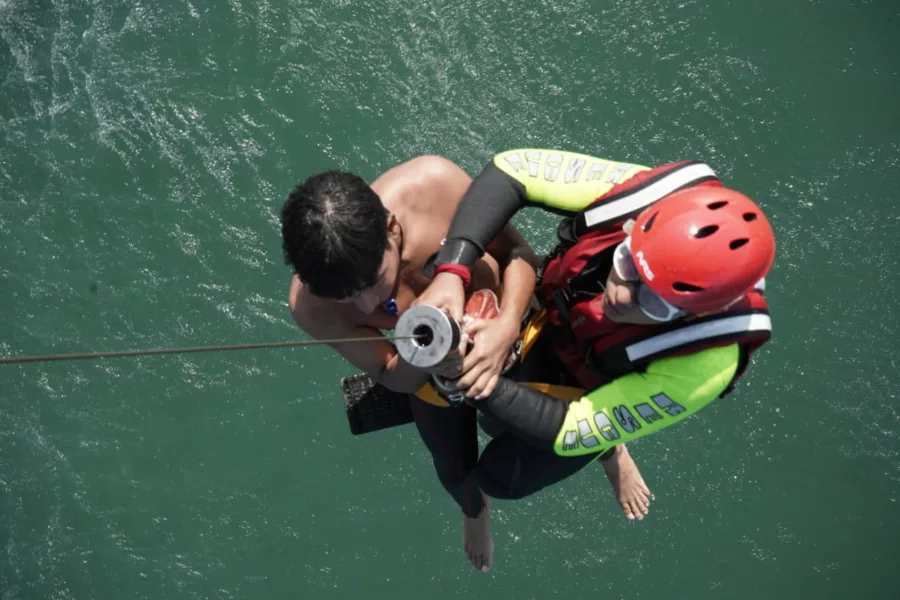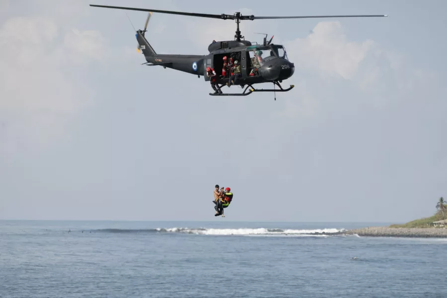 Durante el evento también se realizó un simulacro de rescate con la participación de un helicóptero de la Fuerza Aérea. En la demostración, los guardavidas efectuaron la extracción de una víctima desde aguas profundas, mientras los socorristas brindaron atención prehospitalaria en la orilla del mar.