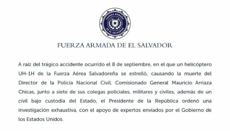 A través de un comunicado, publicado en su cuenta oficial de X, la Fuerza Armada de El Salvador (FAES) informó la noche del sábado que el accidente del helicóptero UH-1H en el que falleció el Director de la Policía Nacional Civil (PNC) el pasado 8 de septiembre fue a causa de «problemas operativos».