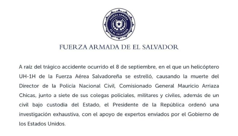 A través de un comunicado, publicado en su cuenta oficial de X, la Fuerza Armada de El Salvador (FAES) informó la noche del sábado que el accidente del helicóptero  UH-1H en el que falleció el Director de la Policía Nacional Civil (PNC) el pasado 8 de septiembre fue a causa de «problemas operativos».