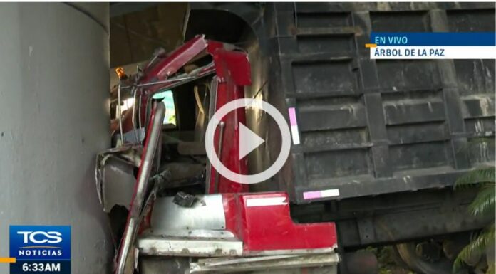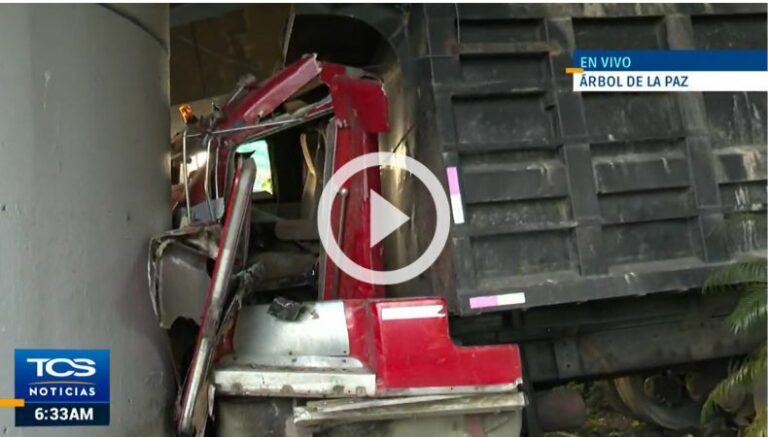 Desde tempranas horas de este día, autoridades de primera respuesta fueron alertados de un accidente de tránsito, donde un camión de volteo impactó contra uno de los pilares del paso a desnivel Árbol de La Paz, sobre el bulevar Los Próceres, San Salvador.