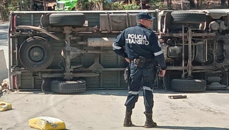 En horas de la tarde, la Policía Nacional Civil (PNC) informó sobre un accidente de tránsito en el que un camión que transportaba bolsas de cemento volcó en la carretera hacia el Puerto de La Libertad, específicamente a la altura de la curva del Papaturro.