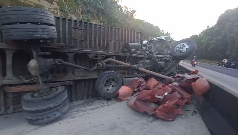 Así quedó el camión que se conducía sin frenos sobre el kilómetro 16 y medio de la carretera Panamericana, en el tramo conocido como Los Chorros. Este camión causó el triple accidente de los vehículos unos metros arriba, y esté volcó en dirección hacia Santa Tecla.
