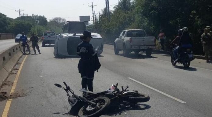 La Policía Nacional Civil (PNC) informó sobre la inspección de un accidente de tránsito, donde un vehículo volcó después de colisionar contra una motocicleta, resultando lesionados ambos conductores.