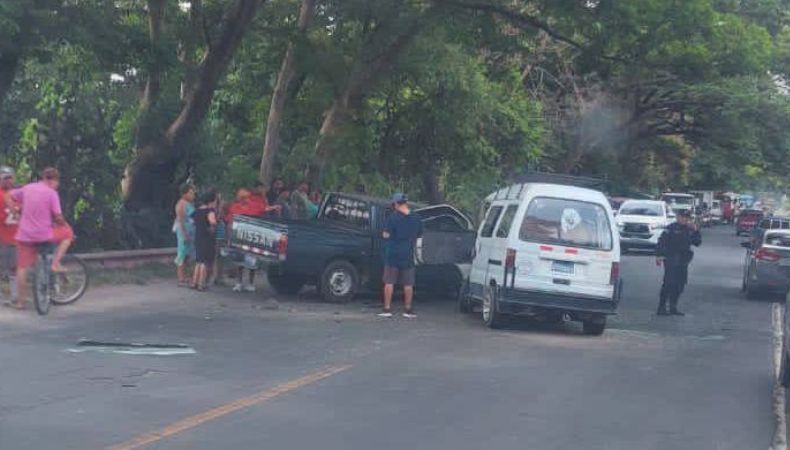 Elementos de la Policía Nacional Civil (PNC) llegaron al lugar para inspeccionar el accidente. El percance dejó varias personas lesionadas y fuerte carga vehicular en la zona.