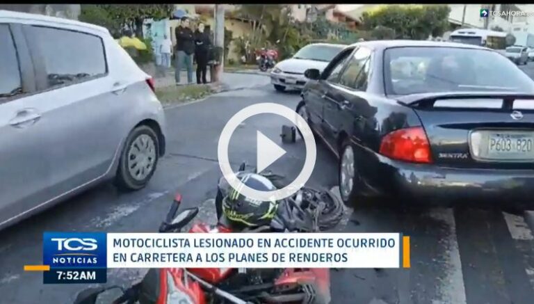 A tempranas horas de este día, Comandos de Salvamento informó sobre un accidente de tránsito, en el que un motociclista resultó con lesiones tras impactar contra un vehículo particular. El percance se produjo en el kilómetro 4 1/2 de la carretera hacia los Planes de Renderos, San Salvador.