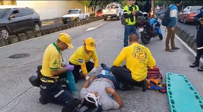 Comandos de Salvamento atendió a un peatón, quien resultó lesionado tras ser atropellado por una motociclista. El accidente ocurrió en la Alameda Juan Pablo II, a la altura del Banco Central de Reserva, en San Salvador.