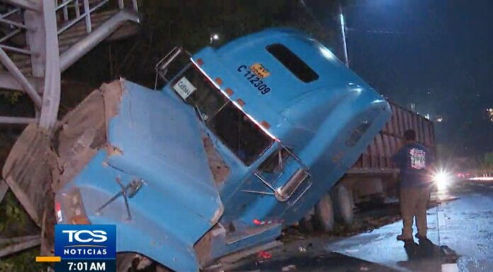 Según el informe de la PNC, el conductor de la rastra cañera se estrelló contra una pasarela al perder el control del vehículo pesado.