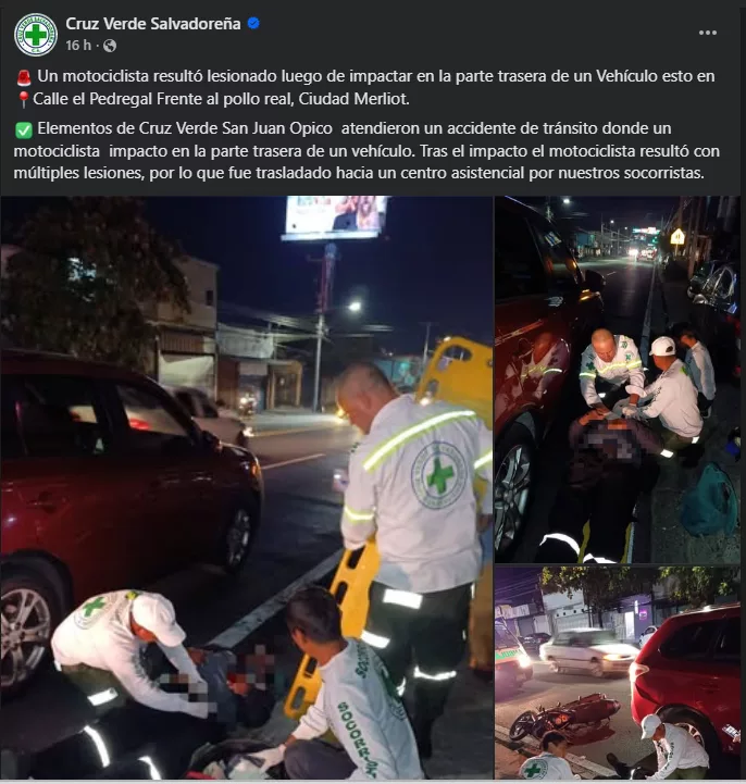 Socorristas de Cruz Verde Salvadoreña atendieron a dos de los afectados en el lugar, mientras que el tercero fue trasladado a un centro médico debido a la gravedad de sus lesiones.