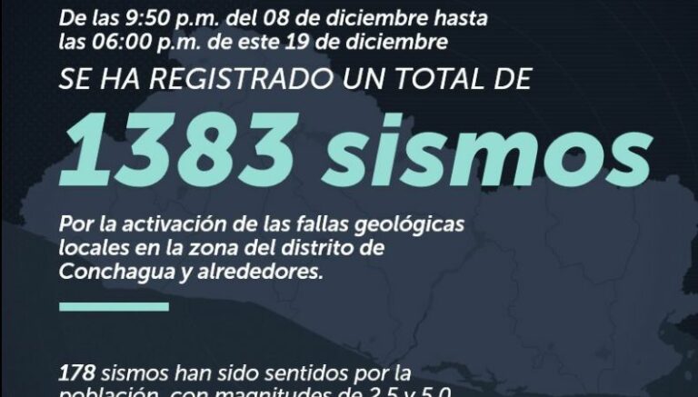 El Ministerio de Medio Ambiente y Recursos Naturales (MARN) reportó que los sismos en Conchagua y sus alrededores, registraron, 1383 réplicas. Esto, tras haber ocurrido el sismo de magnitud 5.8 a las 9:50 p. m. del pasado 8 de diciembre, hasta las 6:00 p. m. de ahora. Además, de esa cantidad, un total de 178 se percibieron por la población. Las magnitudes de estos sismos estuvieron entre 2.5 y 5.0.