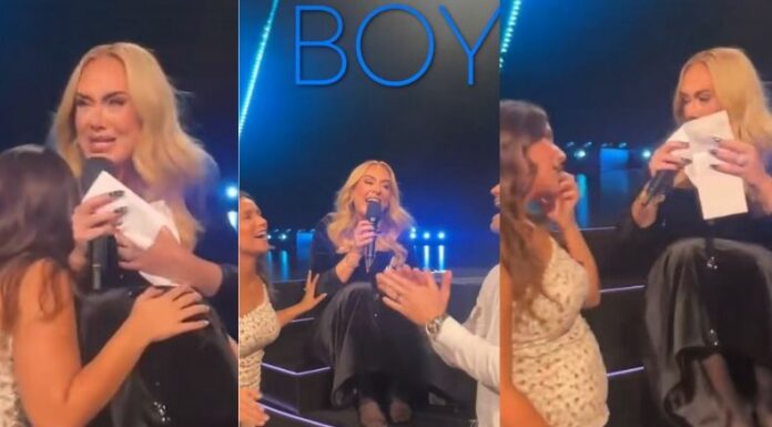 Los fanáticos que solicitaron la revelación de género a la famosa han sido identificados como Chris Dare y su esposa, Shantelle Lord, quienes levantaron un cartel, pidiéndole ayuda a la cantante. «Adele, ¿harás nuestra revelación de género?», decía el letrero.
