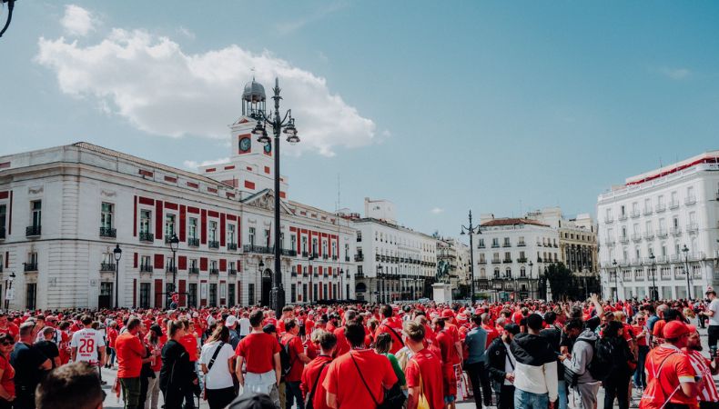 El extenso grupo se reunió en la reconocida plaza Puerta del Sol, donde desplegaron una pancarta y vitorearon cánticos en medio de la acera.