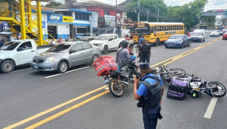 Agentes del Cuerpo Metropolitano de San Salvador (CAM) atienden un accidente de tránsito donde se ven involucradas, al menos, dos motociclistas. De manera preliminar se reporta una persona lesionada. Se desconocen la identidad de la persona y cómo ocurrieron los hechos.