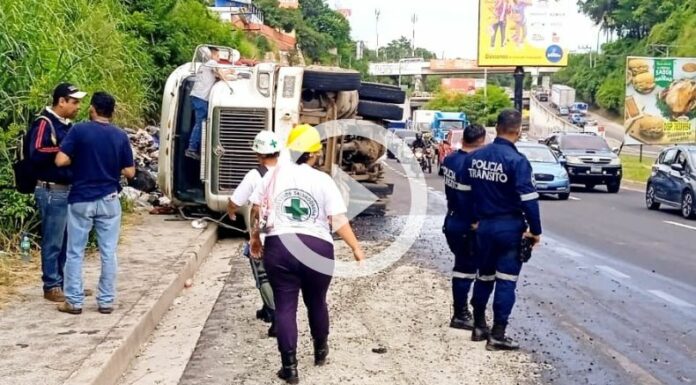 Un accidente de tránsito se reporta la altura del paso desnivel de Apopa. Un conductor de un camión perdió el control y volcó. En el lugar se reporta a un motociclista levemente lesionado.