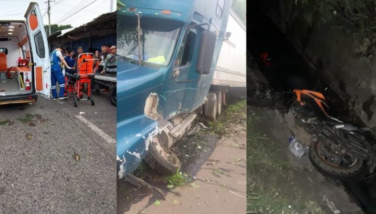 Dos motociclistas impactaron con una rastra mientras ingresaba a un establecimiento, en el sector del km. 27 ½ de la carretera a Sonsonate.