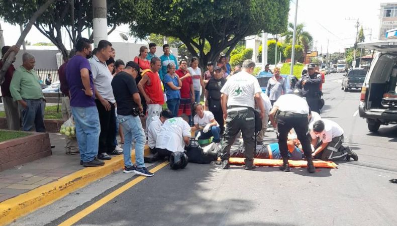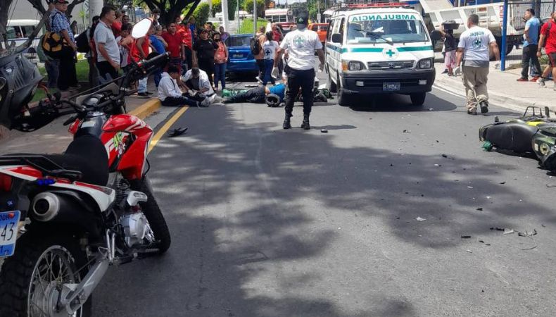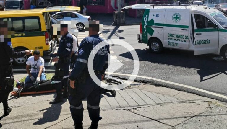 En las cercanías de un centro comercial en Soyapango, equipos de Cruz Verde atienden un sinestro vial. En este suceso, una motocicleta y un bus del transporte público son los involucrados. Las víctimas fueron trasladadas hasta un centro asistencial.