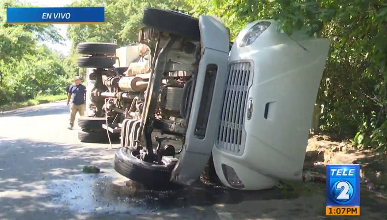 Un camión recolector de basura volcó a la altura de la playa San Diego, en La Libertad, en dirección al Puerto de La Libertad.