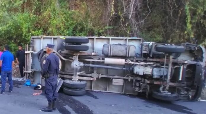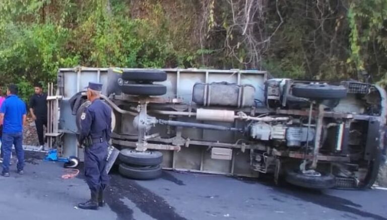 En el reporte preliminar la PNC indica que el camión volcó a causa de desperfectos mecánicos. Las personas que se trasladaban en el carro fueron atendidas en el lugar.