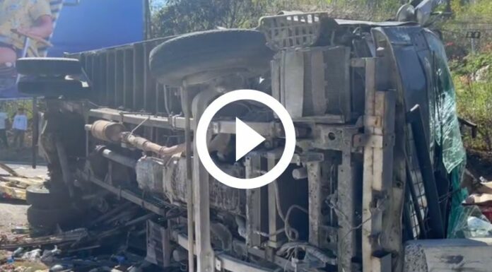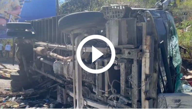 En información de último minuto, un camión volcó sobre el Km. 30 de la carretera al Puerto de La Libertad, en el tramo conocido como la curva del papaturro.
