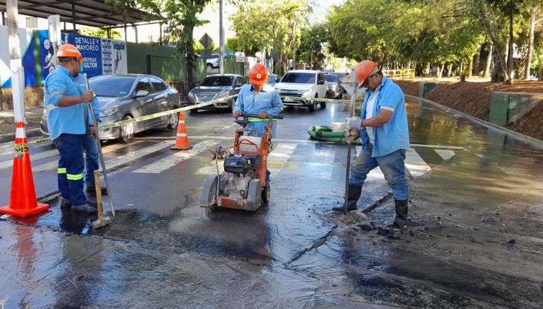En información de última hora, equipos de la Administración Nacional de Acueductos y Alcantarillados (ANDA), desarrollan trabajos de reparación de una tubería de agua potable en el bulevar Merliot, en Sata Tecla.