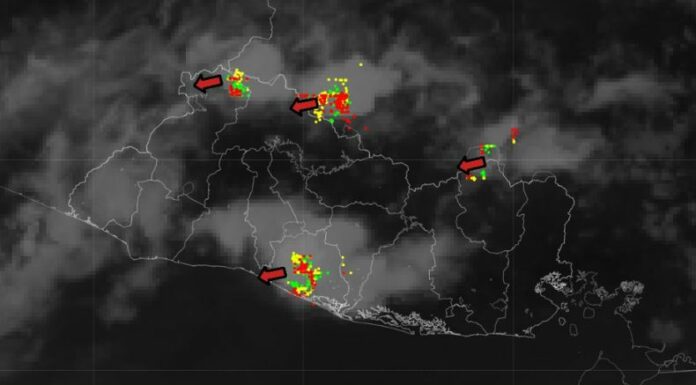 Además, persisten lluvias y tormentas al norte de Morazán, sectores de la cordillera El Bálsamo, norte de La Paz y sur de San Vicente, moviéndose hacia el suroeste. Se registran lluvias y tormentas en los alrededores del lago de Güija, La Palma y San Ignacio.
