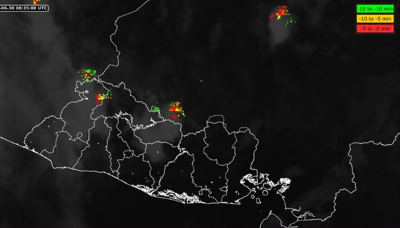 Esta noche, se registran tormentas moderadas a fuertes sobre Cuscatlán, moviéndose hacia el oeste suroeste, alcanzando sectores del Área Metropolitana de San Salvador, en los próximos minutos, acompañadas con abundante eléctrica y ráfagas de viento, según informa el Observatorio del Ministerio de Medio Ambiente y Recursos Naturales (MARN).