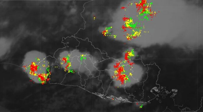 Además, se han registrado tormentas y lluvias en los alrededores del Embalse Cerrón Grande, sierra Berlín-Tecapa, Meanguera, Osicala y sur de Ahuachapán, moviéndose hacia el suroeste.