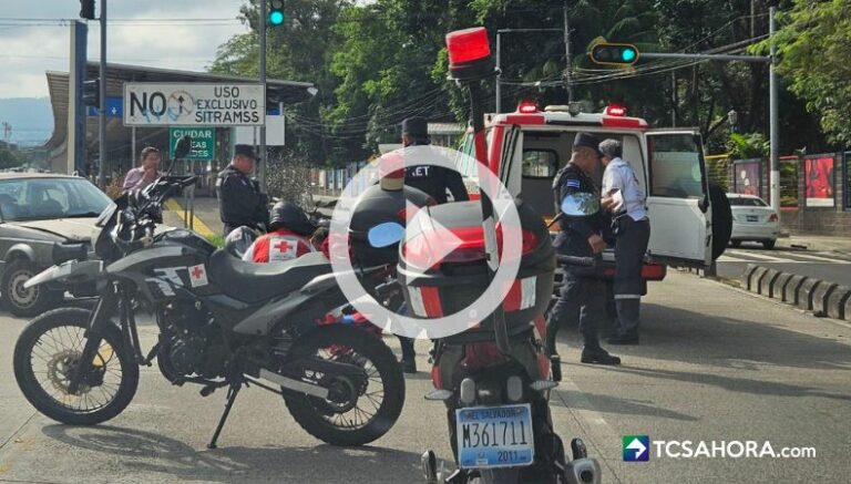 Elementos de Cruz Roja Salvadoreña atendieron esta tarde a una mujer motociclista que sufrió lesiones en la cadera y espalda tras colisionar, presuntamente, con un vehículo particular.