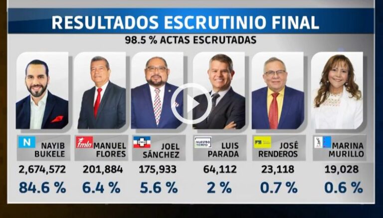 Hasta las 9:30 de la noche de ayer, y con el 98.5 % de actas escrutadas, los datos del escrutinio final de las elecciones presidenciales, el candidato a la presidencia, Nayib Bukele, hasta el momento obtiene más de 2.6 millones de votos.