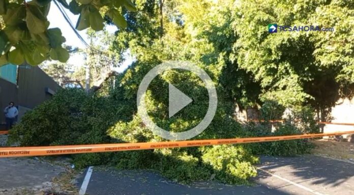 Una rama de grandes proporciones cayó sobre la calle al Mirador, obstaculizando ambos carriles con dirección al redondel Luceiro. Será necesario cortar la energía eléctrica para que Protección Civil remueva el árbol de la vía.
