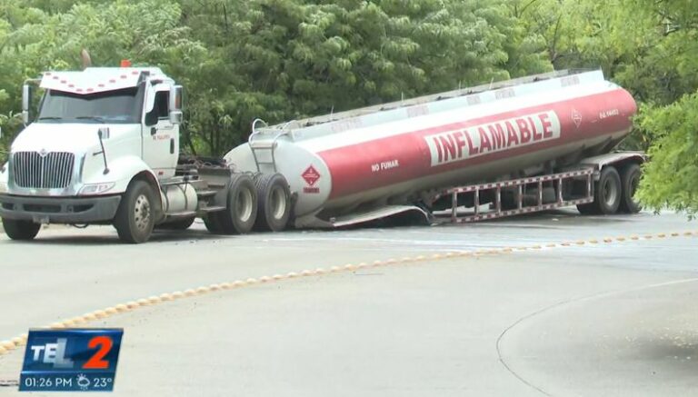 Este percance ocurrió cuando se desprendió parte de la carga. En la zona se reporta derrame de gasolina, los equipos trabajan en la limpieza de la sustancia.