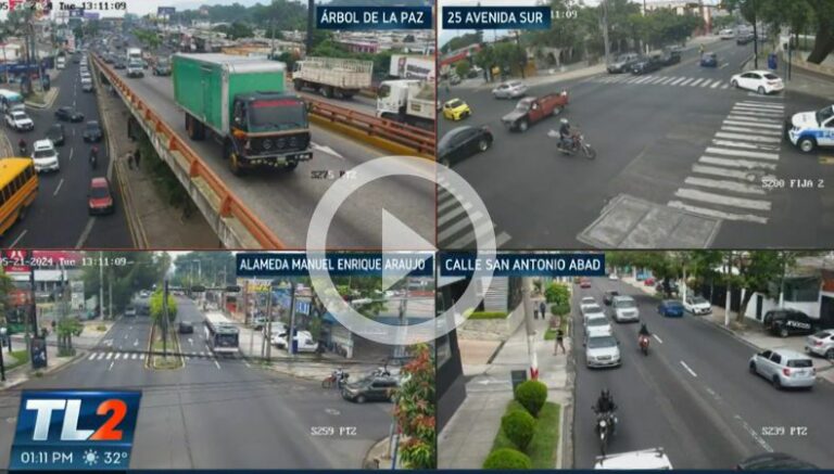 A la 1:10 de la tarde así es la carga vehicular en las inmediaciones del Árbol de La Paz, 25 avenida Sur, Alameda Manuel Enrique Araujo y Calle San Antonio Abad.