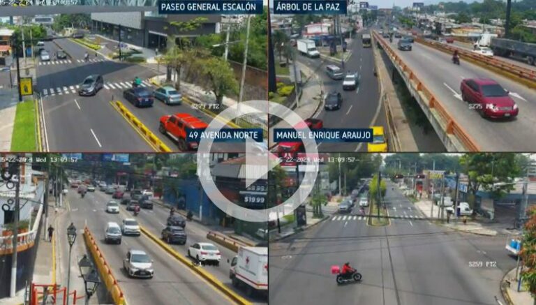A la 1:10 de la tarde así es el tráfico en el Árbol de la Paz, Paseo General Escalón, 49 Avenida Norte y Alameda Manuel Enrique Araujo.
