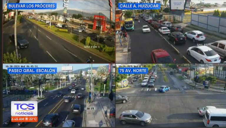 A las 7:23 de la mañana, así es el tráfico que se observa desde las cámaras de videovigilancia de San Salvador en 49 Avenida Norte, Bulevar Los Próceres, Avenida Las Amapolas y Salvador del Mundo.