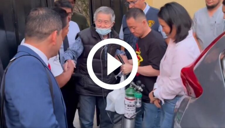 Tal y como se puede apreciar en un video de una duración de 1:45, primero sale su hijo, Kenji Fujimori, vestido con jeans y camiseta, quien sostiene un tanque de oxígeno en sus manos, además de auxiliar la salida del exmandatario de la sede carcelaria de Barbadillo, en el barrio de Ate, en la capital peruana.