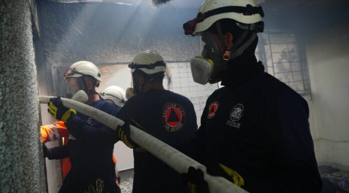 Elementos de primera de respuesta sofocan un incendio estructural en una escuela de manejo. El hecho ocurrió en el pasaje Los Pinos, colonia Florida, Distrito 2, San Salvador, específicamente en los alrededores de un centro comercial.