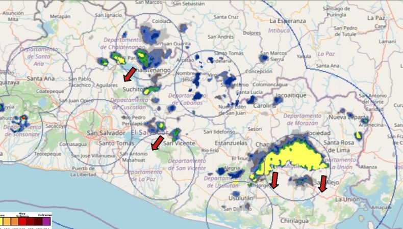Se tienen tormentas eléctricas en zonas de Arcatao, Sesori, Ciudad Barrios, Perquín, Osicala, Corinto, San Francisco Gotera, moviéndose al suroeste. Las tormentas se continuarán desplazando a zonas de Chalatenango, en zona central.