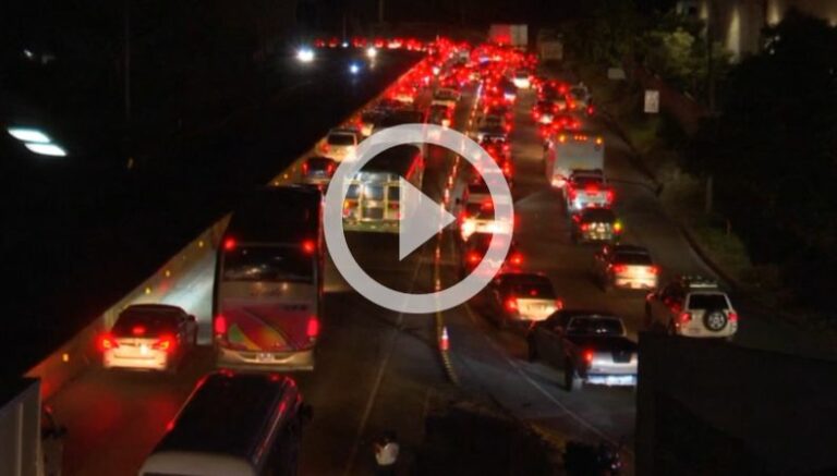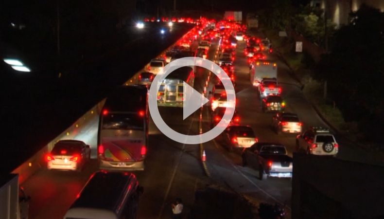 Uno de nuestros equipos de noticieros nos muestran cómo, a esta hora de la noche, aún se tiene un tráfico pesado en la salida de Santa Tecla, en La Libertad. En las tomas se observa cómo los vehículos se encuentran prácticamente con tráfico detenido.