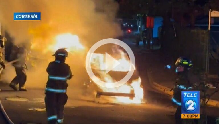 Esta noche, un vehículo se encuentra totalmente consumido por las llamas en la calle Loma Linda, colonia San Benito, en San Salvador. Elementos del Cuerpo de Bomberos ya se encuentran en el lugar controlando el siniestro y evitar que el fuego afecte algunas estructuras que se encuentran cerca, ya que las llamas estuvieron a punto de alcanzar el tendido eléctrico.