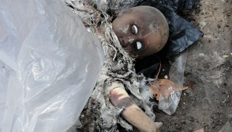 En la foto, se puede ver a una de las comunes muñecas de juguete que hay en las tiendas destinadas para la venta de esos productos. Su aspecto no es muy tradicional, pues se ve harapienta y parece haber sido quemada, dada la oscuridad y suciedad que la rodea.