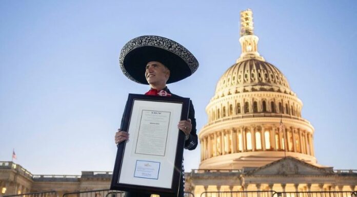 Como un gesto a la ocasión y de respeto, el intérprete de “Me dediqué a perderte” se vistió de charro y durante la ceremonia recordó a su padre fallecido, Vicente Fernández. “No muchos saben que mi papá, en una época, emigró a Estados Unidos. Como muchos que vienen a este país, con el sueño de trabajar, él nunca se hubiera imaginado ver a su hijo y a nuestra música mexicana recibiendo un reconocimiento en el Congreso de este país”, aseveró.