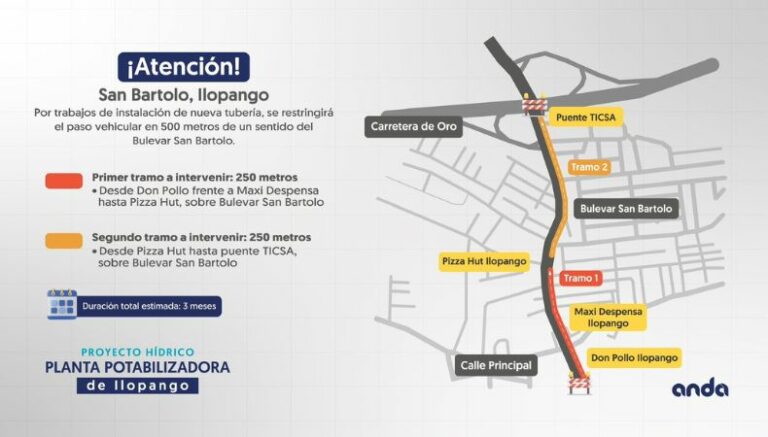 ANDA informó este miércoles que a partir de mañana se restringirá el paso vehicular en 500 metros de un sentido del bulevar San Bartolo. El cierre se debe a que iniciará un nuevo tramo de instalación de tubería desde la calle El Arenal hasta el puente conocido como TICSA.