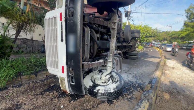 En información de última hora, el periodista Daniel Ayala nos da un reporte desde la calle Monserrat, donde se reporta un aparatoso accidente, en el que un camión volcó. El transporte de carga pesada se desplomó frente a la intersección con la 25 Av. Sur, en el sentido que conduce hacia la colonia Málaga.