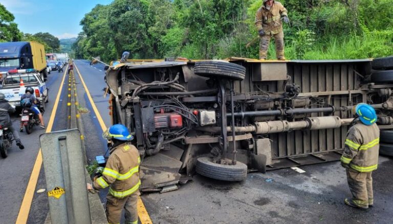 Equipos de Cruz Verde, Bomberos y Comandos de Salvamentos en el lugar de la emergencia. Inicialmente se indican tres personas lesionadas. Este accidente ocurrió en el kilómetro 43 de la Carretera Panamericana, en el sentido que conduce hacia San Salvador.