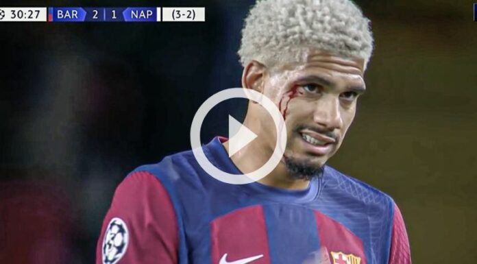 Una de las incidencias de ese partido fue el corte en la cara que sufrió Ronald Araújo tras un choque con Victor Osimhen a la media hora. El central charrúa sangró de la ceja izquierda y tuvo que ser atendido por un especialista médico.
