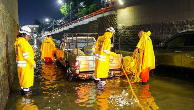 Además, los equipos se trasladaron hasta la Alameda Franklin Roosevelt y paso desnivel de la 49 Avenida Norte, en San Salvador, donde brindaron apoyo a dos vehículos que estaban atrapados debido a la acumulación de agua por las recientes lluvias.