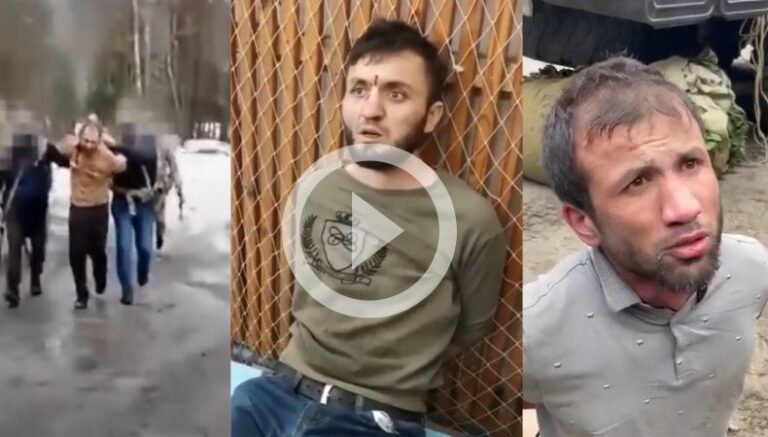 El hombre estuvo temblando durante toda la interpelación. Al principio se le vio tumbado boca abajo, con las manos atadas a la espalda y la barbilla apoyada en la bota de un hombre vestido con uniforme de camuflaje. Más tarde le levantan para ponerle de rodillas.