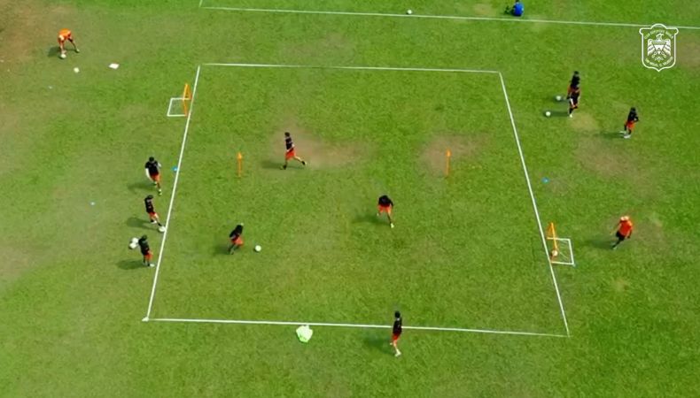 El ejercicio simula acciones favorecedoras y de peligro, pues adentro de un cuadrado los jugadores buscan marcar gol en un extremo y en el otro su objetivo es evitar el disparo de su compañero.