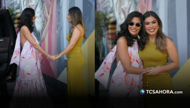 Las imágenes muestran una interacción cercana y natural entre ambas. En la primera fotografía, Linda Sibrián y Sheynnis Palacios aparecen tomadas de las manos, mirándose de frente y sonriendo. Sheynnis luce un vestido largo con estampado de conchas en tonos rosados y lilas, de espalda descubierta y caída fluida, mientras que Linda viste un vestido largo verde oliva, ajustado, de diseño elegante y líneas limpias.
