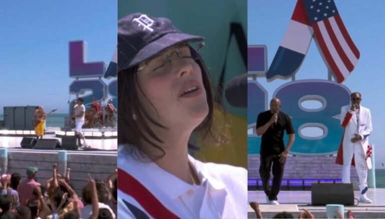 Posteriormente, la banda dio paso la espectacular presentación de Billie Eilish, quien tuvo el honor de subir al escenario acompañada de su hermano, Finneas O’Connell, para cantar, «Birds of a Feather». Luego, hizo su parición el famoso rapero, Snoop Dogg, para interpretar, «Drop It Like It’s Hot» y «The Next Episode« junto a Dr. Dre.