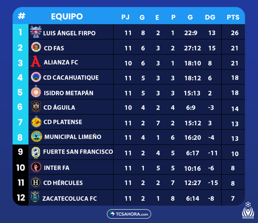 Luis Ángel Firpo se mantiene como líder general de la competencia. Mientras que, Alianza sumó su quinta victoria consecutiva en la fecha 11 del Torneo Apertura 2025.